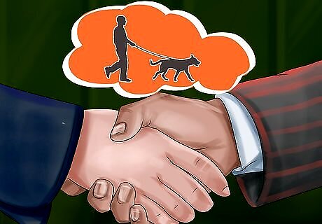 Hire a dog walker. If you don't want to take your dog to a doggy daycare then another option is hiring a dog walker. Perhaps you don't have time in the morning to drop your dog off at a doggy daycare or your dog doesn't like other dogs. If this is the case, a dog walker can come to your home, pick up your dog, and take it for a walk. Different dog walkers structure their walks differently. Some take individual dogs for walks in their own neighborhoods. Others take groups of dogs for walks together. Before hiring a dog walker, discuss the system that they use to walk the dog and be sure that is what you want for your dog.