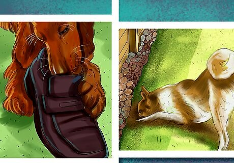 Pay attention to chewing and destruction. One way to tell if your dog is bored is if it starts destroying its surroundings. A dog that chews up your favorite shoes or digs numerous holes in the yard is, in most cases, simply trying to amuse itself. Destruction that is rooted in boredom can come in a variety of forms. It could be chewing any type of item, digging, or even relieving itself inside the house.