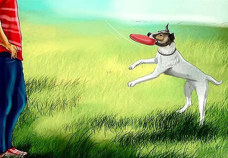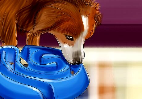 Make feeding time more mentally stimulating. To stimulate your dog's mind, you can make it do some work to get its meals. One way you can do this is by using a puzzle feeder. A puzzle feeder stimulates the dog's mind by making the dog figure out how to get its food out through a puzzle. Another way you can make feeding time more stimulating is by hiding your dog's food and making it find it. This is a good challenge for dogs that enjoy chasing scents.