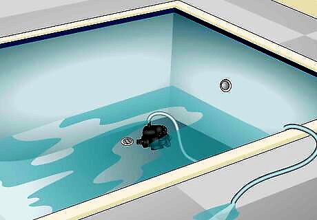 Drain the pool to remove any water. First, disconnect your pool from any plumping. Using a submersible pump, drain all the water from the pool. While it’s generally not recommended to completely drain your inground or above-ground pool, you’ll need to get all of the water out in order to change the liner. If the pump can’t remove the last bits of water from your above-ground pool, you can use a utility knife to cut a small slit into the side of the liner just above the floor. Then, lift the liner so the water drains out the slit. You can also use a siphon hose to remove the water from either an inground or above-ground pool.