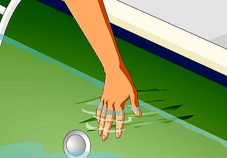 Fill the pool all the way to the top with water. Place a garden hose into your pool, and turn on the water to fill the pool. If you’re using an overlap liner, watch closely to make sure that the edges of the liner don’t slip out of the coping strips and fall down the wall and into the water. While it’s unlikely, it is possible for inground, beaded, and unibead liners to pop out of the track as you fill the pool, so keep an eye on the track on these types of liners as well. Once the pool is filled, you can add any chemicals you use to treat your pool, such as chlorine.