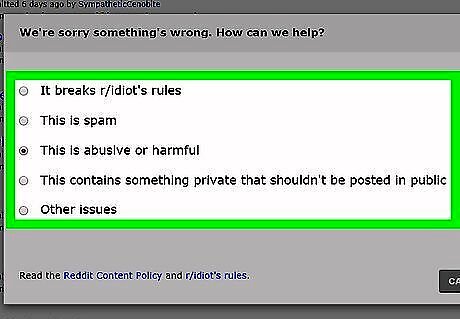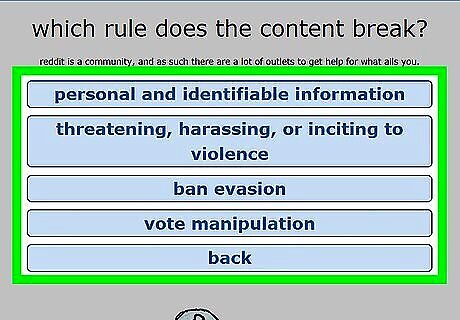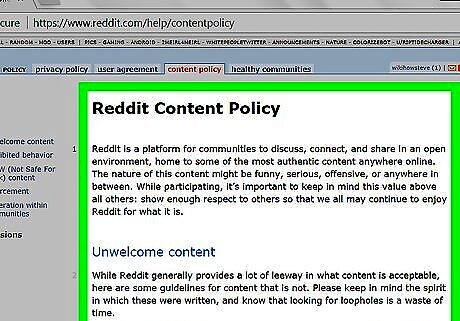 Review Reddit's Content Policy. Reddit's site policy, located at https://www.reddit.com/help/contentpolicy, contains the most up-to-date version of Reddit's rules. Before reporting an entire subreddit, make sure it actually goes against Reddit's policies. If so, continue to the next step. To report a post or user rather than the whole subreddit, see this method.