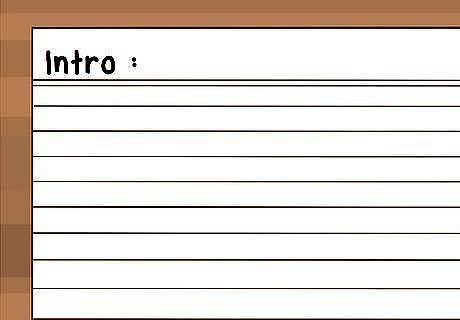Outline your essay on cards. Your cards can also help you to write a long or short paper. Arrange your cards with notes or key points in the order that they will appear in your essay. Move the cards around until the order makes the most sense. This is much easier than re-writing entire portions of your paper. When you are ready to write simply move from card to card adding additional information or transition sentences as needed. To keep everything clear, once you’ve established the order of the cards write a brief note at the top of each regarding its final location. For example, all introduction cards might have “Intro” in the upper corner. Keep a set of notecards with your source information listed as well. One source per card. Include the title, author, publisher, publication date, etc. This information will be used to create your bibliography and references.