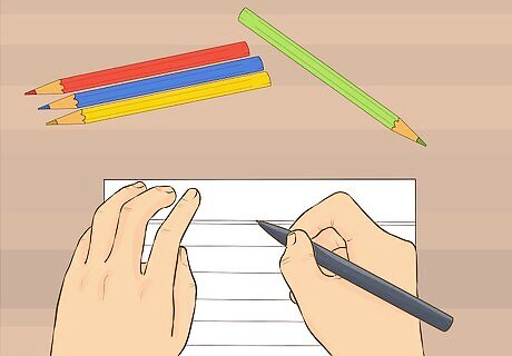 Add color. To fight off boredom and more fully engage your memory, try applying a color scheme to your cards. You could use write in colored pencils, highlighters, or even fine-tipped markers. Underline particularly important information with color. Or, assign specific colors to particular card themes or topics to make for easier sorting. Have a plan when you start to use color on your cards, otherwise your cards could get cluttered and more difficult to study from.