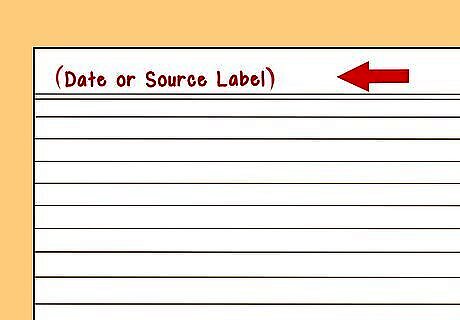 Include a date or source label. At the very top of each card write down the date that the information came from in your class notes or the page number of the source and the abbreviated source name. You want a way to track back the information from your card to the original source. This is helpful when citing or if you choose to sort your cards. If you are making notecards for a multiple classes, use different colored cards or keep them in rubber banded stacks.