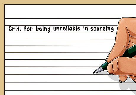 Take notes over specific sources. Whether you are writing a paper or preparing for a test over various sources, you can use notecards to keep track of your research materials. Put the title and author on one side of the card and few statements about the argument, evidence, methodology, etc., on the other side. Depending on your end goal, you could also include a few points of criticism as well. For example, “Crit. for being unreliable in sourcing.” As you take notes over sources, make sure to include quotations when pulling directly from the text. Otherwise, you could accidentally plagiarize if you use these materials when writing later.