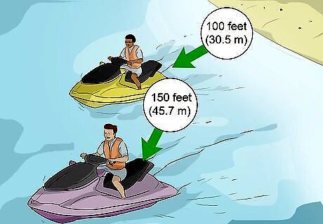 Know the rules. All boats which are underway and up on-plane are required to be AT LEAST 100 feet (30.5 m) from other boats and AT LEAST 150 feet (45.7 m) from shore or docks. The same rules apply to PWCs.