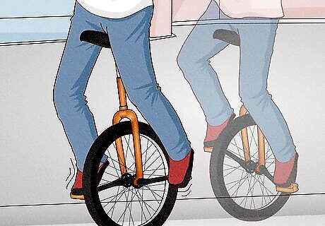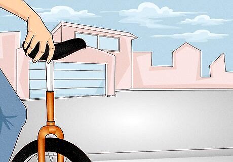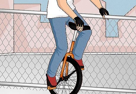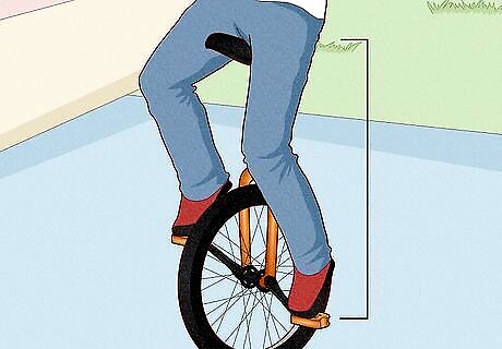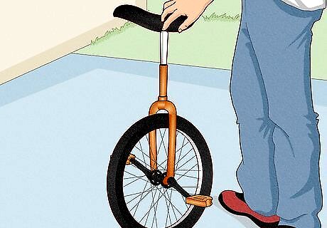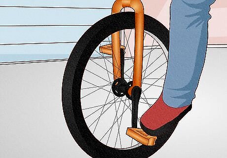 Align the pedal cranks vertically to the ground when you mount a unicycle. (One pedal will be as close to the ground as is possible, while the uni is upright.) Step on that pedal with the foot of your weaker leg. Throw your leg over the seat, and sit on the uni. Then, step on the other pedal. Pull yourself up while holding onto something for support.