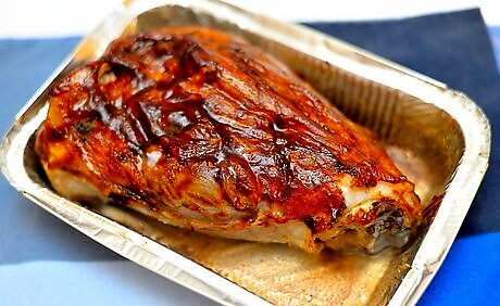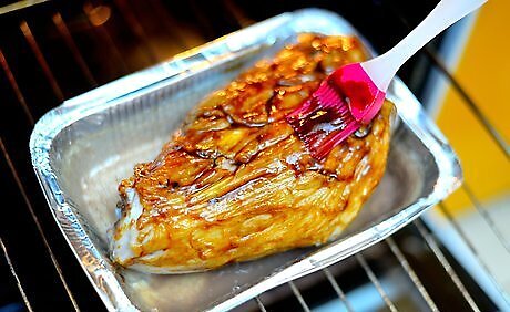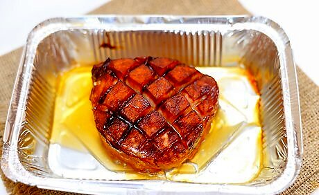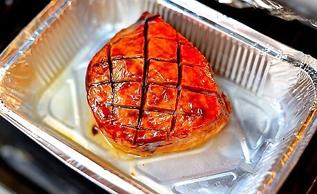 Spread the glaze over the ham if you're using one. Remove the ham when it reaches the proper temperature. When using a liquid glaze, use a pastry brush to coat the outside of the ham. For dry glazes, carefully pat the glaze on by hand. The score marks you made will hold the glaze in place. Generally, the glaze should be added within the last 30 minutes of cooking time. You can also pull the ham out halfway through the cooking time to reapply the glaze.
