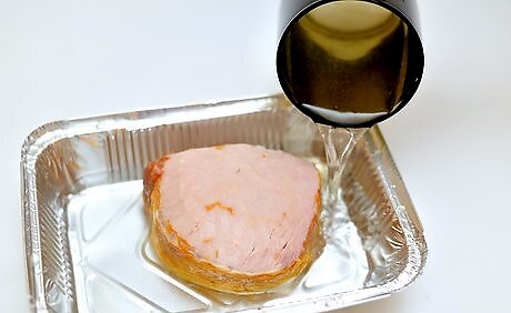 Pour 1 cup of water into the roasting pan. Fill the bottom of the pan with 1 cup (240 mL) of water. If your pan doesn't have high sides, you'll need to check the pan as it cooks and replace the water as needed. The steam provides extra heat and protects the pan from burns. If you choose to cook the ham uncovered in the next step, you'll only need ⁄4 in (6.4 mm) of water.