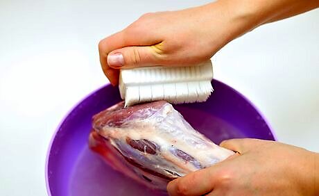 Scrub the mold off the ham if it is uncooked. Move the ham to a stream of warm water. Using a stiff-bristled brush, rub away any dark spots you see. These spots are mold and dirt, so you'll want to take care of them before cooking. Don't worry, the mold isn't harmful. It comes from the curing and aging process, similar to some cheeses.