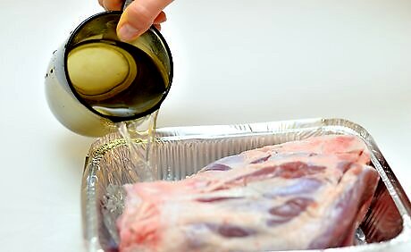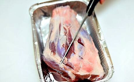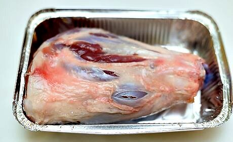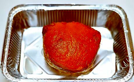 Place the ham on a roasting pan. Keep the fat side facing upwards. A roasting pan is the best choice, since it'll be deep enough to hold the ham and the amount of water you'll add to it. You'll usually need a pan with sides about 3 in (7.6 cm) tall.