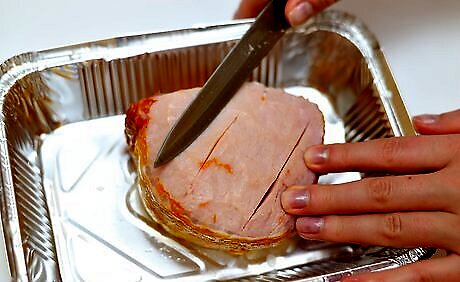 Score the ham with a chef's knife. First, cut away most of the outside fat. Leave a layer ⁄4 in (6.4 mm) thick. Then use the end of a chef's knife to score the ham in a diamond pattern. Be careful to avoid cutting into the meat.