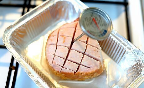 Check the ham's temperature with a meat thermometer. Pull out the ham after 2 hours and unwrap the foil. Push the end of the thermometer into the thickest part of the ham. The temperature should read about 120 °F (49 °C). If it isn't, rewrap the foil and continue cooking.