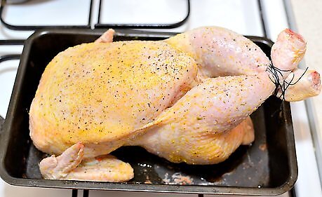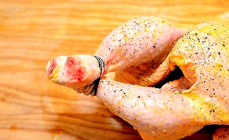 Truss the legs simply. Before you put poultry in the oven, tie the legs together using kitchen twine. This helps to cook the chicken evenly and make sure any stuffing will remain inside the bird. If left untied, the legs of the poultry will cook more quickly and will become very dry, if they're not kept in tight to the rest of the bird, cooking more evenly. There are a lot of fancy ways to truss a chicken, but the simplest is just to tie the legs together with a small piece of twine. Make a simple bow knot and call it a day.