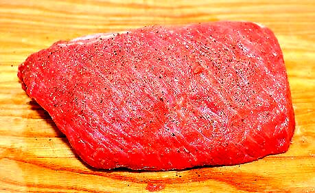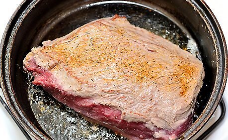 Season beef simply. You can get fancy with rubs and marinades, but the truth of the matter is beef is best served with the simplest seasonings. Roasted beef tastes better uncluttered. Season your roast immediately before putting it in the oven, when it's up to room temperature. Coat the beef liberally with a fat source, like gram oil, or whatever your favorite cooking oil is. Butter or herbed butter is also a perfectly effective way of coating your meat for a delicious nutty-finish on the crust. Salt and black pepper should be sprinkled liberally on each side of beef. Use your hands and pat it in gently, so the seasoning sticks.
