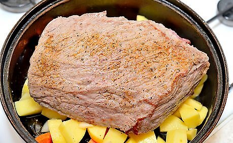 Cook in a roasting pan on a bed of chopped vegetables. The best way to cook a beef roast is in a pan on seasonally-appropriate vegetables. As the juices run out of the meat, they'll help to cook and flavor the vegetables, which will end up tasting delicious, and forming the base for a great gravy, if you want to strain it out. You can also just serve up the vegetables as a side. Couldn't be easier. Try roughly chopping carrots, onions, and red-skin potatoes and lining them in the bottom of the pan. You don't have to season them now. When you've seasoned your beef, rest it directly on top of the vegetables and you're ready to go.