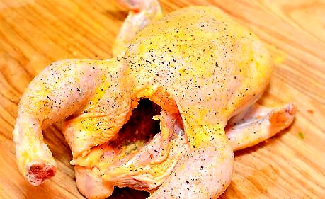 Season the outside and the inside. Even if you've marinated your poultry, it's a good idea to season it liberally with salt and pepper, both inside the cavity and out. This helps to season the meat from all angles and give the meat the most flavor while it cooks. The saltiness will transfer throughout the meat as it releases its juices.