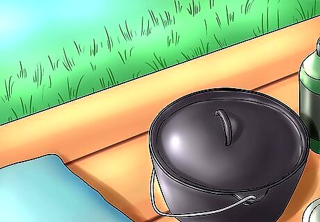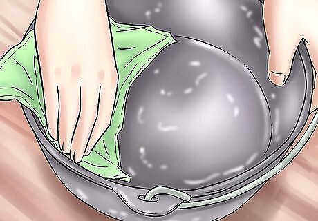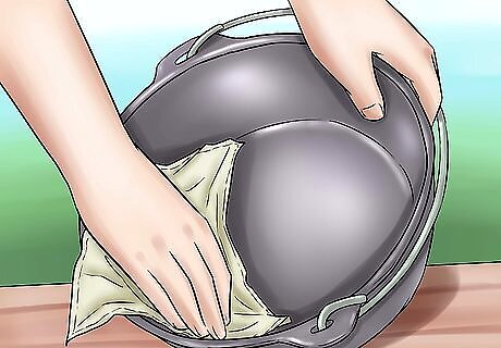 Grease the Dutch Oven. With a rag or paper towel, generously lube up your cast iron with food-grade safe oil, inside and out. You do not need to do the handle.