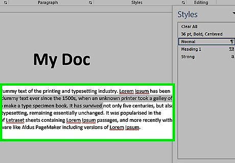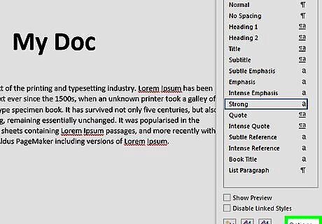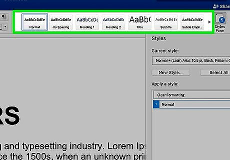 Click anywhere in your document to see which style is used. The style used in the paragraph you clicked will now appear highlighted in the Styles pane. Hover your mouse over the name of the style in the Styles pane to see its details, such as font size, face, and color. To modify a Style, hover the mouse over its name and click the small arrow. To change the style of part of your document, highlight the part you want to change, then click a style in the Styles pane.