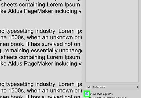 Place a checkmark next to “Show Styles Guides.” Now the Styles toolbox lists only the styles used in the current document. To view a style's details (such as font size, color, etc.), hover your mouse over its name. Each style name is preceded by a colored box containing a number. Colored boxes now also appear along the left side of your document.