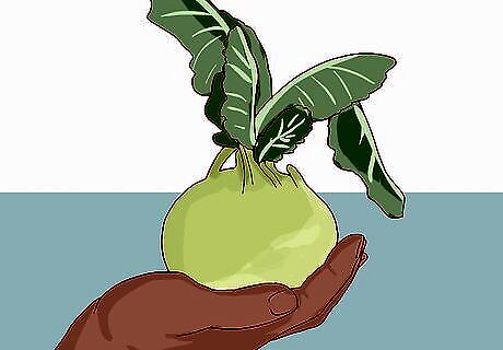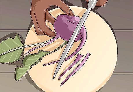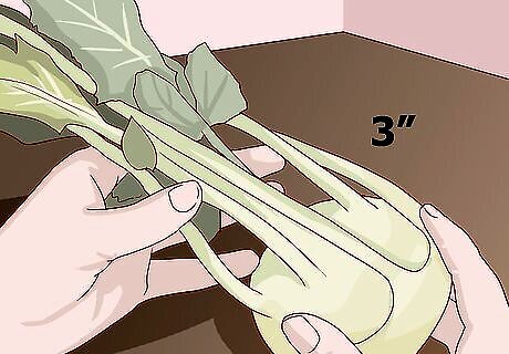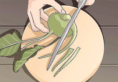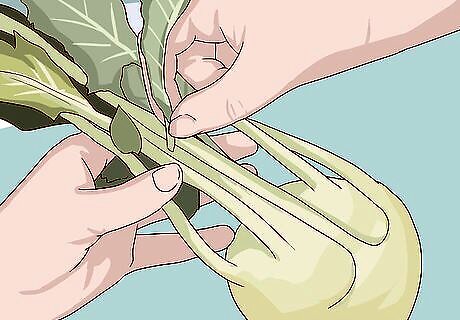 Remove the leaves. If you’ve purchased a whole kohlrabi with the leaves and stems, remove the leaves from the bulb. The leaves are edible. The leaves are similar in flavor and can be used like kale or spinach. The leaves must be used a few days after they are removed from the bulb or else they will go bad.