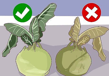 Pick firm green leaves. If buying a whole kohlrabi, with the leaves attached, opt for leaves that are dark green in color and firm to the touch. Kohlrabi plants with the leaves attached are often more fresh than the bulbs that have had their leaves removed. Avoid yellow or wilting leaves.