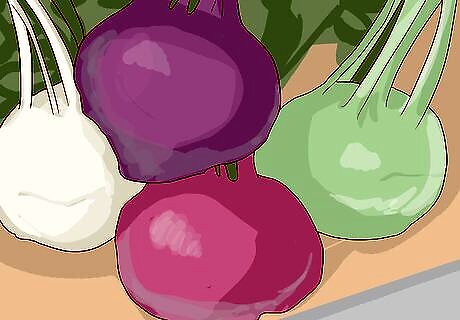 Select a small size. Look for kohlrabi bulbs that are approximately 3” in diameter, about the size of a tennis ball. The smaller bulbs are sweeter and more tender. Their taste is similar to peeled broccoli stems. Avoid larger bulbs as their taste will be sharper and more woody. They also have a thicker peel.