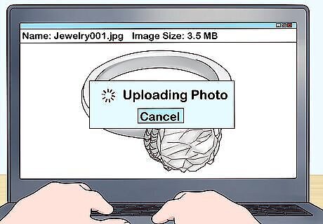 Upload high quality, well-lit photographs. When you list your items for sale, include high-resolution photographs from multiple angles. Use a solid-colored sheet or curtain for a backdrop so background clutter doesn’t draw attention away from your jewelry. If you’re listing several items together, such as a set of earrings with a matching a necklace, upload photographs of both the set and individual pieces. If necessary, include photographs of any flaws, and mention them in the description. Potential buyers need a clear idea of what they’re purchasing or bidding on, and they’ll give you poor ratings if they feel mislead after completing the sale. Be sure to clean and polish your jewelry before photographing it.