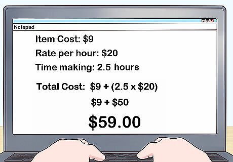 Calculate your prices based on your materials and labor cost. Keep detailed notes of the raw materials you use and the length of time you spend working on a piece. Decide the rate you expect to earn per hour, and multiply your rate times the hours you spent creating a piece. For instance, if an item's materials cost $9, and you spend 2.5 hours making it at a rate of $20 an hour, the item's price would be $9 + (2.5 x $20), or $59. When deciding your rate, take your level of experience into consideration. If you're an established jewelry designer, you can charge a higher rate. However, if you're just starting out, you'll need to make sure your prices are competitive. To get an idea of your pieces' market value, browse online and at boutiques for handmade items that are comparable to your designs.