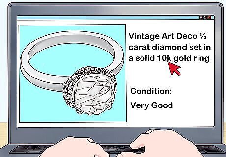 Include keywords in your descriptions to generate more clicks. Mention details such as carat (for gemstones), karat (for gold), brand names, certifications, and condition. Try to tell an interesting story to garner interest, such as by writing that an item has been in your family for ages or a piece is a custom, one-of-a-kind find. Having your jewelry appraised or researching its brand, composition, and value on your own will help you put together a quality description. While you want to include plenty of details, keep in mind your listing should be concise and organized. For instance, “Vintage Art Deco ½ carat diamond set in a solid 10k gold ring” contains plenty of keywords without packing in unnecessary fluff. Additionally, make sure it’s free of spelling and grammatical errors, which would lower your credibility.