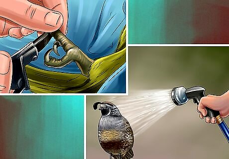 Clean your quails up and make sure they’re in healthy condition. If you’re going to sell your quail to a pet shop you’ll want to make sure they look clean and looked after properly. You can clean them using water, trim their claws, and clip their wings. Quail that are cloudy eyes, huddled up, panting, or have wounds on them are most likely poorly. You should get your quail checked out by a veterinarian if they show any of these signs.