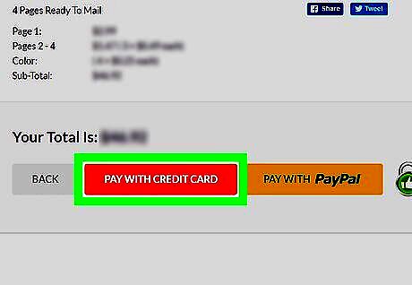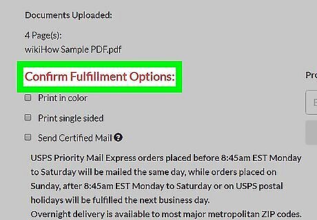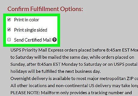 Select additional options for your mail. You can check the box next to any of the following "Confirm Fulfillment Options" entries to add preferences to your mail: Mail me a copy - Sends a copy of your mail to you. This doubles your current total. Print in color - Uses color printing instead of black-and-white. Doing this will add a $0.25 fee for each page in your mail. Print single-sides - Splits each double-sided page into two distinct pages. This will increase your mail cost. Send Certified Mail - Adds a tracking link for your mail for $8.99. You can use this link to track your mail's progress. Include Return Envelope - Adds a return envelope for $1.00.