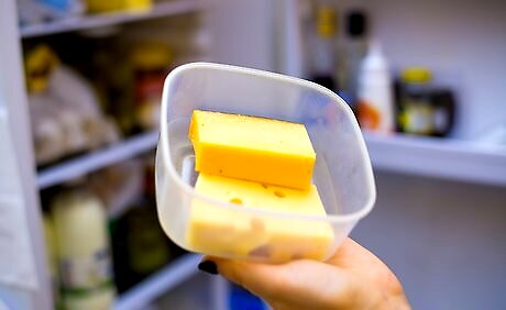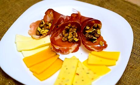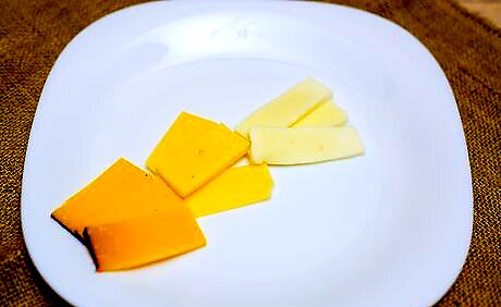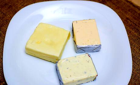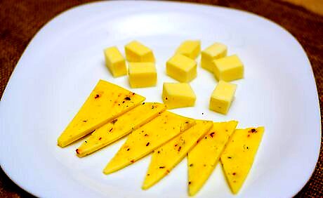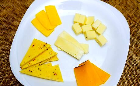Precut hard, semi-hard and semi-soft cheeses into wedges or cubes. You should slice firmer cheeses before serving them to your guests. With the harder cheese in particular, you do not want your guests struggling to cut off slices on the tray. Make things easy for your guests by slicing or breaking off chunks of the cheese beforehand. Hard and semi-hard cheeses include gouda, cheddar, Swiss and parmesan. Semi-soft cheeses include bleu cheese, Monterey Jack and Havarti. Exposure to the air can really enhance the flavor of certain semi-hard cheeses.