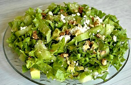 Serve walnuts on salads. Adding a few walnuts to any salad increases the salad’s fat content slightly. You need a little bit of fat in your daily diet, and adding walnuts to what’s otherwise a really healthy meal can help you get that daily amount without going overboard. Walnuts pair best with salads that include fruit and cheese. For example, you can throw together some mixed greens, sliced pears (use fresh, not canned, pears for this recipe), dried cherries, and raw or candied walnuts to make a great salad.