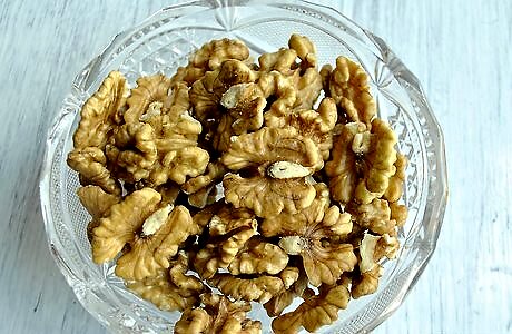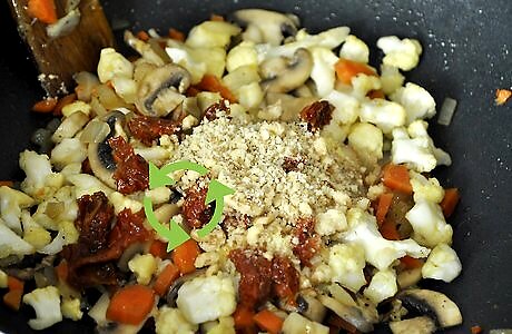 Use walnuts as a meat substitute. This one sounds a little crazy, but using walnuts alongside other ingredients like cauliflower can give you the taste and texture of meat while keeping your dish vegetarian. This type of substitution is great if you’re vegetarian or vegan and miss certain flavors or if you’re just trying to save some money at the grocery store. To make a vegetarian meat substitute with walnuts, cook a finely chopped mix of cauliflower, mushrooms, carrots, yellow onion, and garlic in a skillet over medium high heat for about 5 minutes. Add a finely chopped meal of walnuts and sundried tomatoes to the veggies on the stove and cook for 1 minute. 2 cups (16 oz) of this mix will replace 1 pound of meat.