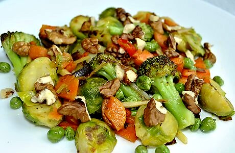 Add crunch to vegetable sides. If you’re tired of serving up plain vegetables, add walnuts to the recipe. In a lot of cases, the mild flavor of the walnuts actually enhances the flavor of the vegetables. For example, you can toss ¼ cup (2 oz) crushed walnuts with blanched brussel sprouts, sautéed shallots, champagne vinegar, and Dijon mustard.
