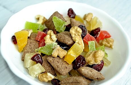 Use them in a snack mix. Walnuts are a great addition to any snack mix you might want to whip up. Add them to your choice of dried fruit (cranberries, pineapple, and banana chips are great options) and a handful or two of coated chocolate candy for an easy snack mix.