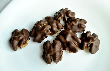 Dress them up. If raw walnuts aren’t your style, try dressing them up a little. Walnuts are great candied or dipped in chocolate and make a nice addition to an hors d’oeuvres table, especially during the holidays. Make maple candied walnuts by quickly adding 1 cup (8 oz) raw walnut halves, 2 tablespoons (1 oz) maple syrup and a pinch of salt to a hot skillet that’s been sitting over medium high heat. Stir constantly until the nuts are coated and the syrup has evaporated. Be careful not to let the syrup burn. Let them cool on wax paper, pulling them apart as they do so. Store in an airtight container. You can also simply melt some chocolate – dark or milk – and dip the walnuts in about halfway. Lay them on wax paper to dry completely and then store in an airtight container.