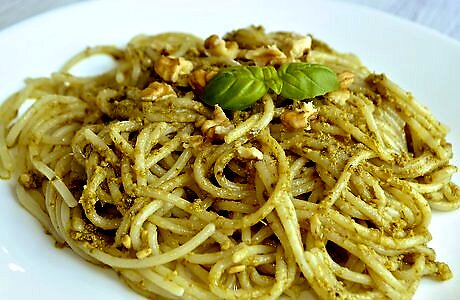Replace fats with walnuts. You can create healthier versions of recipes that call for fats like butter by using walnuts instead. Walnuts are high in fat content, but it’s much healthier fat than what you find in butter, so you don’t have to feel so guilty about those recipes! For example, replacing the butter in pesto with walnuts gives you a creamy, delicious texture and taste with less calories. Blend basil, olive oil, finely chopped walnuts, and garlic cloves in a food processor. Add a bit of Parmesan cheese and blend for five to 10 seconds more. You can also use walnuts to make walnut butter. Walnuts are generally better for you than peanuts (and people are often allergic to peanuts but not walnuts), so this is a great substitution. Blend equal amounts roasted walnuts and raw walnuts in the food processor for about 30 seconds. Add honey and a pinch of salt and blend until smooth.
