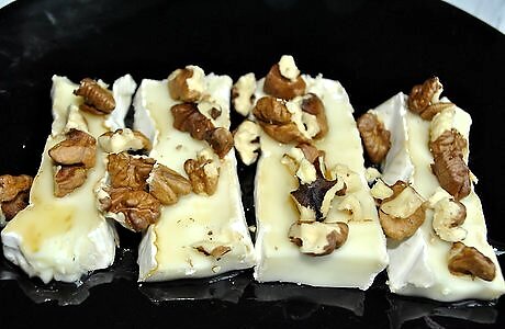 Serve walnuts with cheese dishes. Walnuts pair really well with cheese. Adding them to any cheese appetizer is a great way to punch up the flavor. It also adds a different texture to the smoothness of the cheese. For example, you can top brie with roasted walnuts. Crush the roasted nuts into small pieces and serve them over the brie with a few tablespoons of honey and spices. For a more individual cheese dish with walnuts, stuff a date with one tablespoon of goat cheese, then stick a walnut half into the cheese. These are a great option if you’re looking for a way to serve walnuts at a less formal dinner or cocktail party because they’re easier for your guests to handle as they mingle.