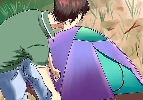 Find an appropriate campsite. Wherever you're camping, in the backyard or the backcountry, you need to look for an appropriate space that will provide you the most comfortable camping experience possible. There are several factors to consider, but the first is to make sure that the area you've selected to camp upon is legal and available for camping. If you're in a state or national park, make sure that you've set up in a designated campsite. Often, these will be marked with numbered metal posts and will feature picnic tables, fire pits, and sometimes water spigots for using. If you're backcountry camping, make sure that you follow the regulations for the park or nature reserve in which you're camping. Different parks will have regulations about how close you're allowed to camp to water, for example, or how close you can camp next to the trail. Wherever you're camping, it's always critical to avoid private property to avoid a rude awakening in the middle of your camping trip from an angry landowner. Never camp anywhere camping is not permitted.