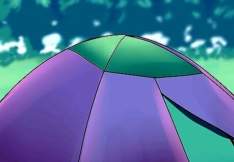Find a break from sun and shade. Ideally, a tent should be placed so that it will remain in shade throughout the following morning, especially if it’s hot out. And even though a dome tent is wind resistant, it’s also a good idea to find as much of a wind break as possible, in case the weather should pick up while you're out hiking or away from the tent. The last thing you'd want is to come back to an empty camp site! Placing a tent to the west of a hillside or a treeline would be the best way of giving yourself the most comfortable night inside and a cool morning to follow. Never camp under trees. If it's raining, or threatening rain, it can be tempting to think that setting up under some tree cover would be a safe alternative. Unfortunately, this risks lightning and other hazards. A tent won't stop a falling branch, should something happen. Set up well-clear of such hazards.