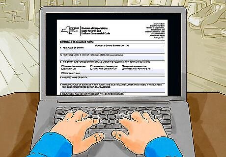 File a certificate of assumed name. The certificate is here: https://dos.ny.gov/system/files/documents/2018/10/1338-f.pdf. However, each county might have its own form, so check with the court clerk. Enter information directly into the form or print the form off and use black ink. You must file the form with the county clerk for every county where you intend to do business. The fee is $25. You may need to pay more depending on the counties where you file. Remember to get a copy of the form, which you will need when you open a bank account. You might need to pay a small fee.