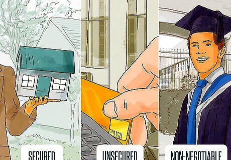 Categorize your debts. Not all debts are the same. You should divide them into the following categories so that you can decide how to tackle them. Secured debt. This is debt backed up by collateral. Your home loan or car loan are common examples. Unsecured debt. Credit card, personal loans, and medical debt are common examples. No collateral backs up this debt. Non-negotiable debt. Some debt can’t be negotiated or is very difficult to negotiate. Your alimony and child support payments, as well as student loans, are in this category.
