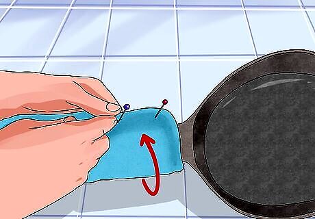 Fold the potholder in half over the skillet handle. Take a potholder and fold it over the skillet handle to see where you need to sew it. To mark the area where you want to sew, place a few pins in the potholder to keep it in a folded position. Then, slide the potholder off the handle. You may even want to mark the line where you want to sew with a piece of chalk.
