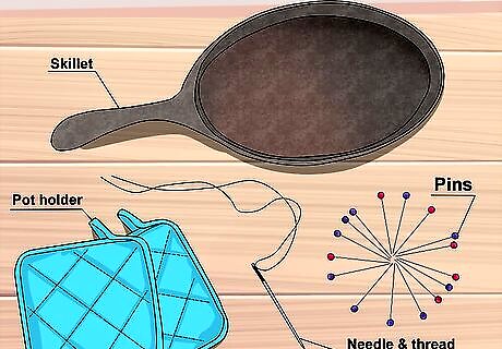 Gather your materials. One of the easiest ways to make a skillet handle cover is to turn a potholder into one. To do this, you will need: A potholder. You can use an old potholder, or get a new one for the purpose of turning it into a skillet handle cover. Skillet (for measuring) Pins Needle and thread or a sewing machine