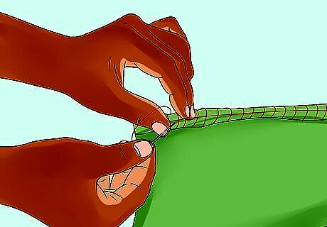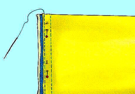 Sew along the pinned edge. To secure the potholder to use as a skillet handle cover, sew along the pinned edge, removing the pins as you go. Try not to sew too far away from the pins to ensure that you get a good fit for your skillet handle. After sewing along the pinned edge, your handle cover is ready to use. Slip it onto a skillet handle to try it out!