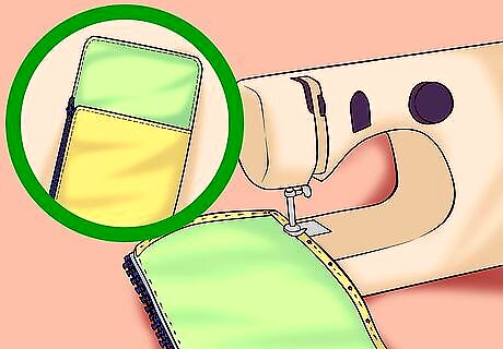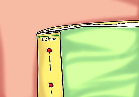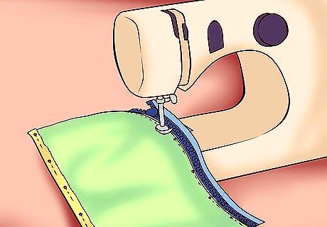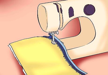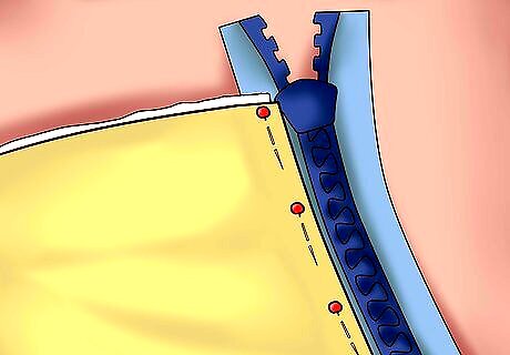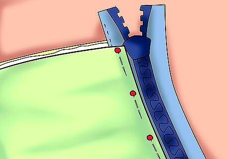 Baste the zipper in place. To keep the zipper in place while you sew everything else together, use your sewing machine to baste the zipper to the fabric pieces. Make sure that you do not sew the fabric pieces together. Just sew a baste stitch about ¼ to ½ inch from the inner fabric’s edges. Remove the pins as you go. After you finish the baste stitch, fold over the edge of the inner fabric so that the raw edge is tucked under. You will be hiding this and securing the zipper more permanently when you stitch the three pieces of fabric together.