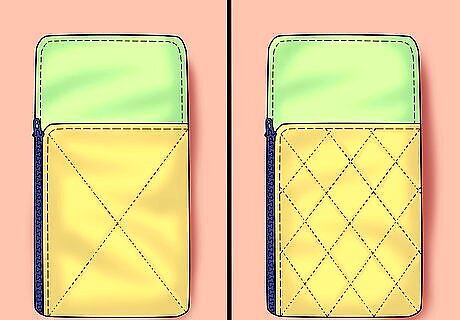 Sew across all layers for a quilted effect. If you want your doll sleeping bag to look like it is quilted, then you can sew across all layers of fabric in a criss-crossing pattern to create a quilted effect. To do this, start at one corner and sew all the way to the opposite corner. Then, start sewing at another corner and sew to the opposite corner. The result will be a big X across the fabric. Keep repeating this criss-crossing pattern by moving the starting point up a couple of inches each time. This works best if you do it before adding the zipper and hemming the other side.